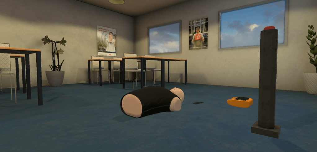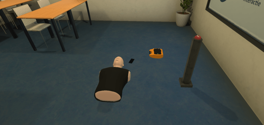 In this VR application, the player has to operate an AED on a dummy, this is a virtual representation of a real-life AED training. A real-life training should never be replaced, however, a virtual training can help to keep the training routine going.